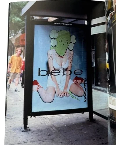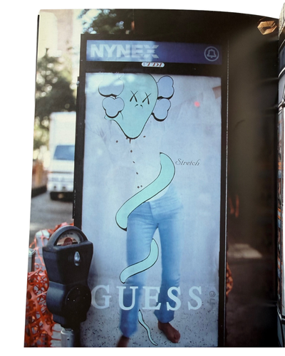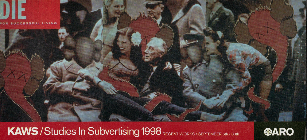 KAWS’ work consists of found commercial advertisements(billboards, bus stop ads, and subway placards) which he carefully removes from their fixtures and smuggles back to his studio. There he swiftly embellishes these with his handpainted tags, personalizing and recontextualizing the advertising messages before returning them to their original locations, on the street, for public viewing.